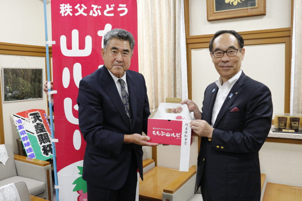 秩父ぶどう連絡協議会ちちぶ山ルビー部会は令和7年8月26日、大野元裕埼玉県知事を表敬訪問し、秩父地域限定品種のブドウ「ちちぶ山ルビー」のPRをしました。