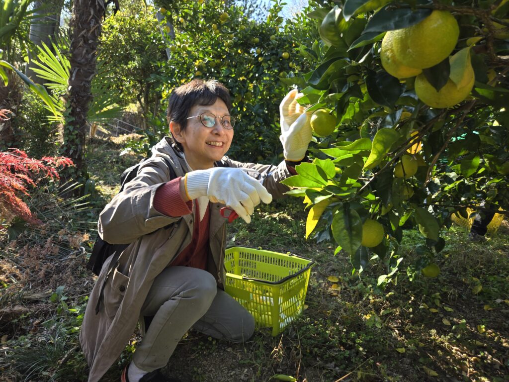 体験は全国農協観光協会が企画したツアーの一環で、部会の新井瞭寿さんの圃場で、黄色く熟した「黄金のかぼす」を収穫しました。