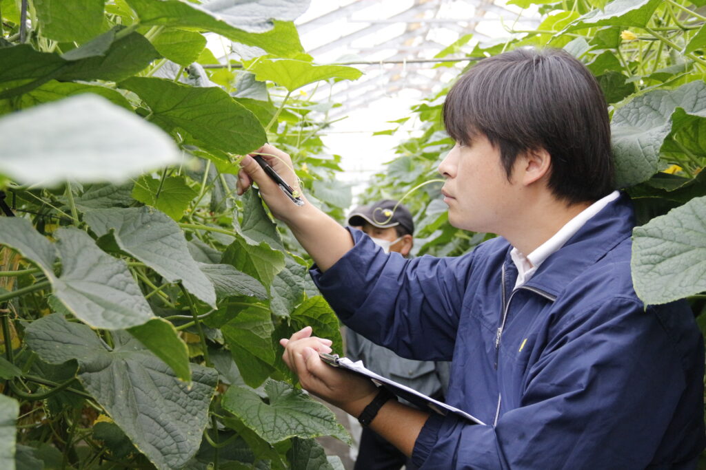 審査したキュウリは、7月末から8月上旬に定植。夏期の酷暑により、根の活動の低下に伴う樹勢低下や、まがり果の発生といった影響を受けました。
