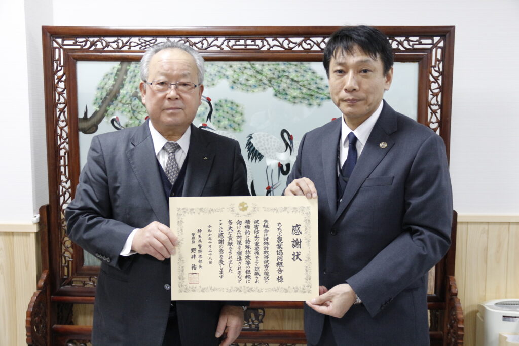 JAちちぶは、特殊詐欺等の被害防止に向けた対策について、令和7年12月16日に埼玉県警察本部より感謝状を受け取りました。