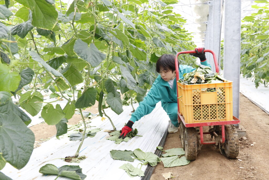 生徒はキュウリの出荷荷造りや、摘葉後の葉の片付けなどを体験。「同じ作業が続くと大変」などと感想を話しました。